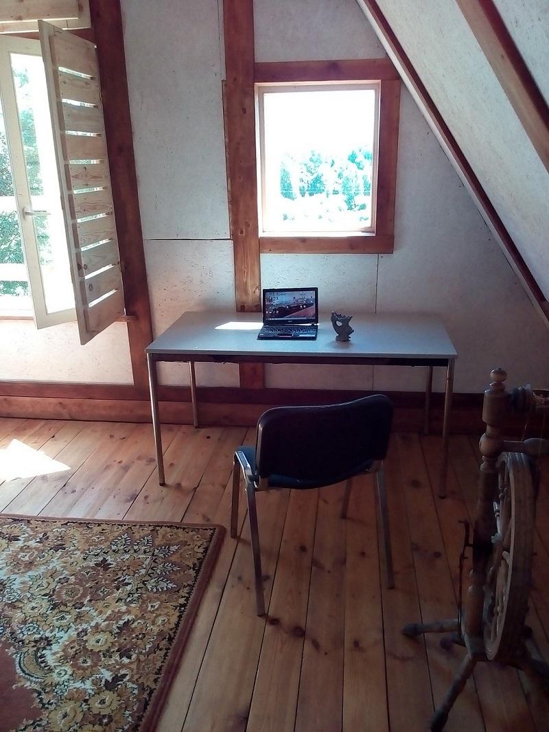— У гэтым цудоўным пакоі каля акна я праводжу за камп’ютарам як мінімум 5-6 гадзін, — адказаў ён. — Наогул, творчае жыццё яно такое: правесці мяжу паміж працай і адпачынкам вельмі цяжка. Я ўжо гадоў 20, як перастаў разумець, што такое адпачынак. Ты ходзіш у лес, гуляеш па гэтых каптарунскіх джунглях, ляжыш у высокай траве, а ў галаву прыходзяць новыя і новыя ідэі. Ты думаеш пра творчасць, усё пераасэнсоўваеш, будуеш планы на заўтра.