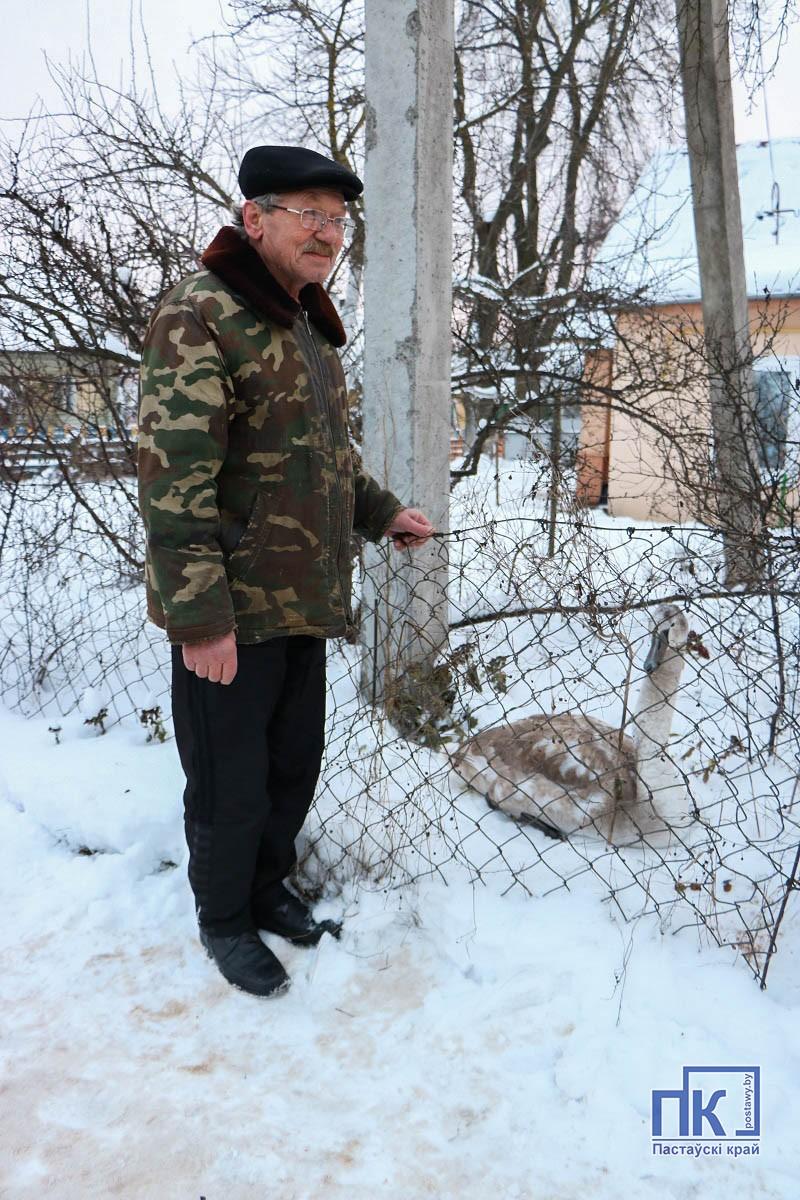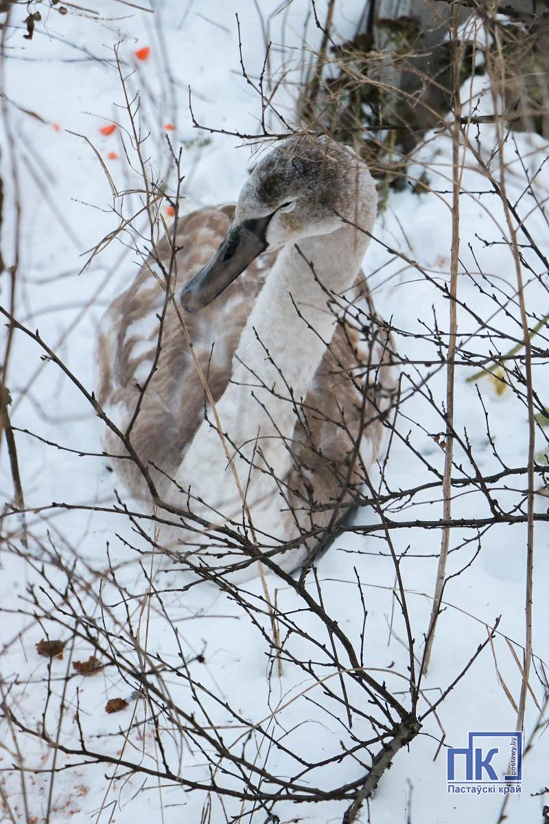 «Дзядуля, глядзі, а што там такое ў агародзе?» Гэта пытанне раніцай пачуў ад унука пастаўчанін Васілій Мінчанкоў, які пражывае зусім побач з плошчай Камсамольскай. Прыгледзеўся і вачам сваімі не адразу паверыў: пад кустом прыхаваўся малады, яшчэ шэры, лебедзь.