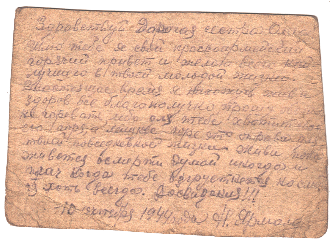 Пра што новаспечаны салдат пісаў родным? На шчасце, час сцёр з паперы толькі асобныя словы, у цэлым жа пісьмы добра чытаюцца. Вось, напрыклад, урывак з аднаго з іх: «Здравствуй, дорогая сестра Ольга! Шлю тебе свой красноармейский привет и желаю всего наилучшего в твоей молодой жизни. В настоящее время я жив и здоров, всё благополучно, прошу… не горевать, ибо для тебя хватит твоего горя, а лишнее горе — это отрава для твоей повседневной жизни. Живи, пока живётся, иногда думай о смерти, плачь, когда тебе взгрустнётся, но смейся хоть всегда. До свидания».