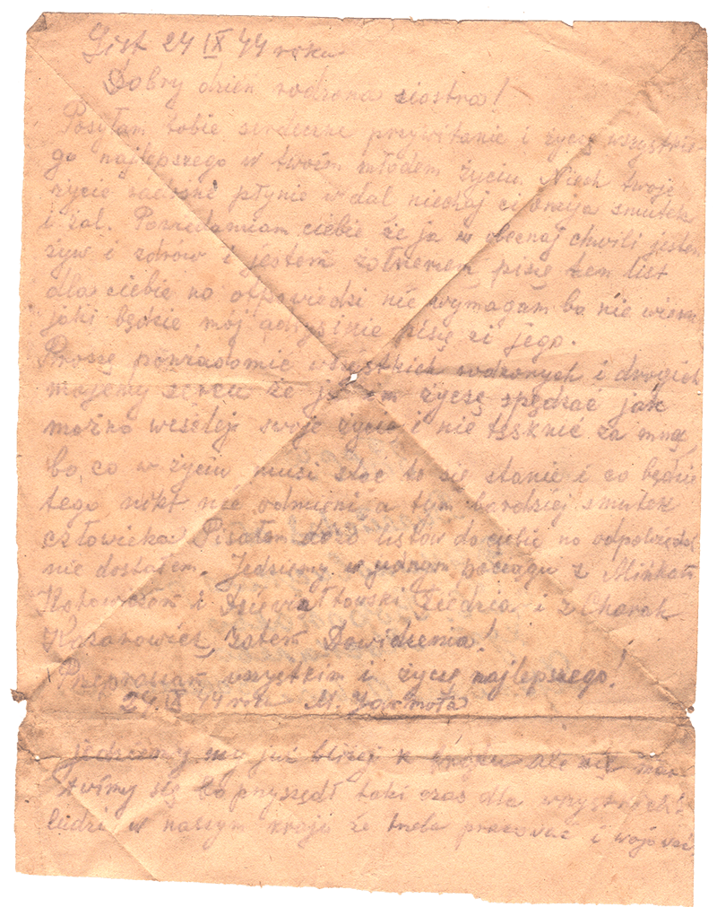 А вось пісьмо, напісанае Мікалаем Ярмолам па дарозе на фронт (перакладзена з польскай мовы В. Кейзікам на беларускую): «Добры дзень, родная сястра!.. Інфармую цябе, што ў дадзеную хвіліну я жывы і здаровы. Гэта пісьмо пішу ўжо салдатам. Але адказу не патрабую, бо не ведаю, які ў мяне будзе адрас. Прашу паведаміць усім блізкім майму сэрцу людзям, што я жадаю ім спаўнення ўсіх жаданняў. Не сумуйце па мне, бо што ў маім жыцці павінна быць, тое і станецца. А што будзе, ніхто не ўсведамляе, тым больш што чалавек смяротны. …Прыйшоў такі час для ўсіх людзей, што трэба ваяваць і прарвацца.