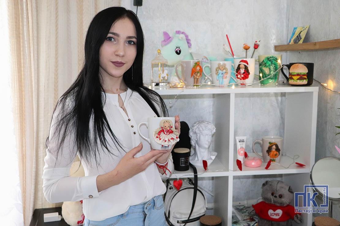 Пастаўчанка Марыя Шаруева любіць частаваць гасцей хатняй выпечкай — сама і пірагі пячэ, і торты. Аднак у электрычнай духоўцы маладой гаспадыні часта можна ўбачыць… кубкі, дэкарыраваныя прыгажунямі-лялькамі і іншымі фігурамі. Упрыгажэнні гэтыя зроблены з палімернай гліны, а таму і трэба іх «запякаць» пры высокай тэмпературы.