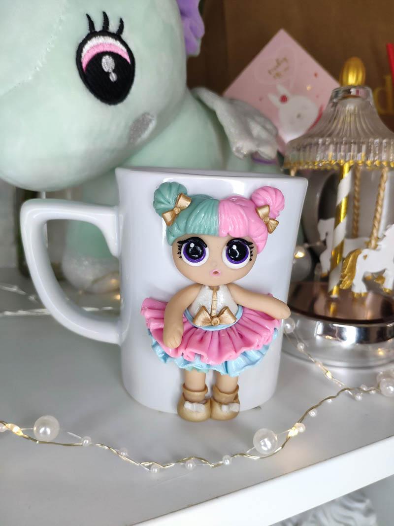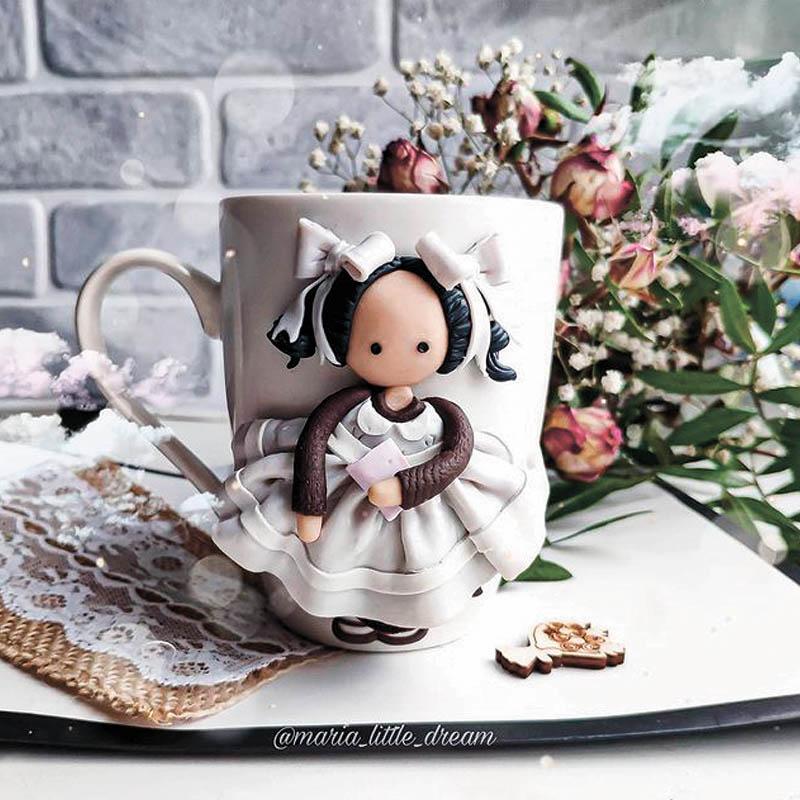 А яна насамрэч патрабуе шмат часу. Каб вырабіць адзін кубак з лялькай, патрэбны не адзін дзень. А яшчэ — цэлы «арсенал» самых разнастайных матэрыялаў і прылад. Як іх многа, пераканалася на свае вочы, калі падышла да рабочага стала Машы. Там ляжалі некалькі дзясяткаў рознакаляровых брускоў гліны, яе размякчыцель, клей, шматлікія ножычкі і нажніцы, акрылавыя фарбы, тканіна для лялечнага адзення, лак для пакрыцця вырабу, насадкі для кандытарскага мяшка і нават… лакшынарэзка. Аказваецца, дзякуючы ёй, можна ператварыць тонкі пласт гліны ў пышную сукенку з валанамі.