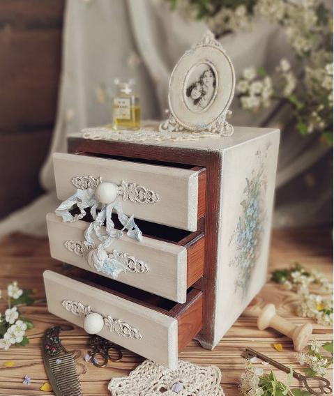 Сейчас мастера больше всего привлекает декор интерьера. Основной вид её творческой деятельности — декупаж (это техника декорирования предметов, основанная на присоединении рисунка, картины или орнамента). Начинала с простого — с изготовления разделочных досок. Обучаясь в интернете, постепенно стала создавать и другие вещи: ключницы, шкатулки, рамочки… Друзья и знакомые были в восторге и стали заказывать их на подарки.