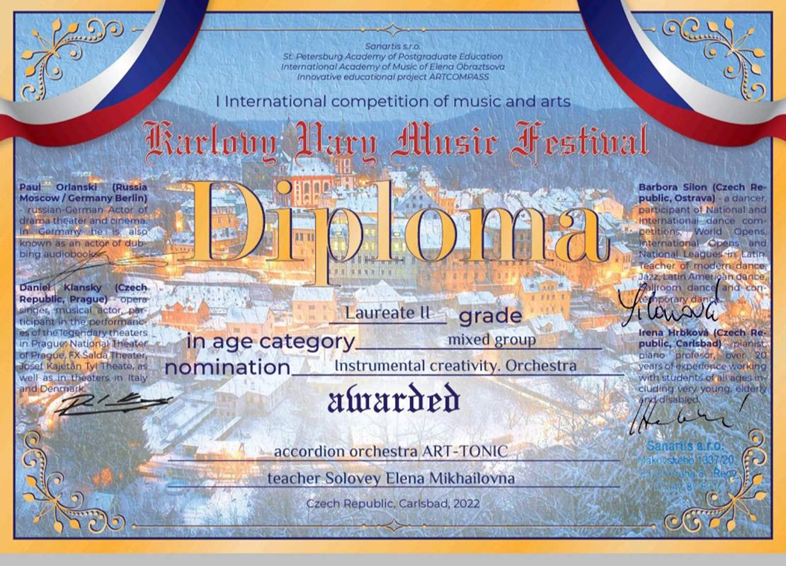 Диплом из Карловых Вар получил оркестр баянистов «Арт-тоника» новосёлковского филиала Воропаевской детской школы искусств им. И. Сушко.