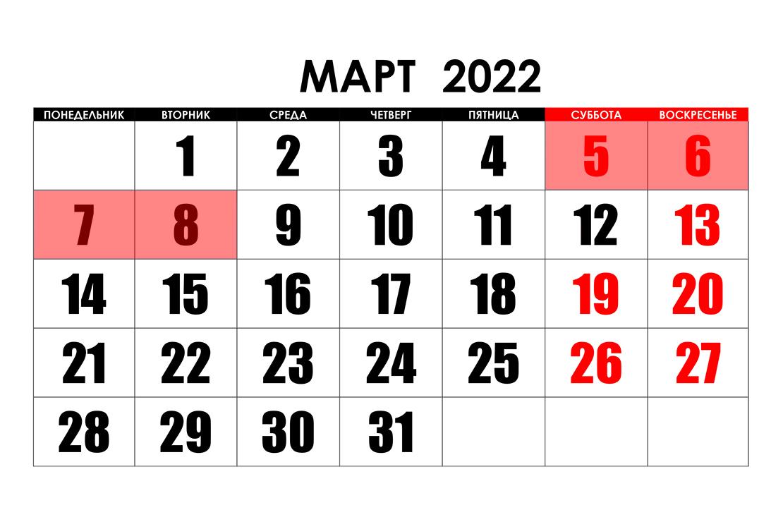 В частности, белорусов в марте ждет мини-отпуск. 8 марта в этом году выпадает на вторник, поэтому отдыхать будем целых четыре дня: 5, 6, 7 и 8 марта. Однако поработать за 7 марта придется в субботу 12 числа.