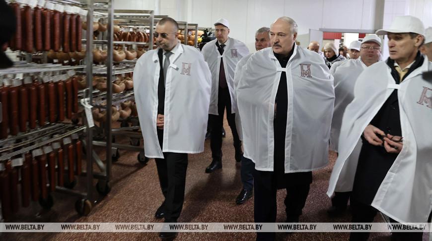 Президент Беларуси Александр Лукашенко в Глубоком после посещения молочно-консервного комбината и дегустации сгущенки приехал на мясокомбинат, передает корреспондент БЕЛТА.