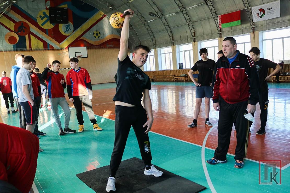 Трэба было бачыць, як стараліся юнакі зарабіць як мага больш балаў для сваёй каманды, дэманструючы выдатную фізічную форму! Так, гіру яны паднімалі на выцягнутай уверх руцэ ў сярэднім па 110 разоў, а Мурат Мустафаеў з СШ №3 зрабіў ажно 120 рыўкоў. Падцягнуцца на перакладзіне кожны ўдзельнік змог каля 13 разоў. Найлепшы ж вынік — 18 падцягванняў — паказаў Ілья Кулак з СШ №2 імя Н. М. Асяненкі. У комплексе «пад’ём тулава—адцісканне» не было роўных навучэнцу каледжа Сяргею Быкаву, які выканаў гэта практыкаванне 75 разоў за 1 хвіліну пры сярэднім паказчыку 60 разоў.