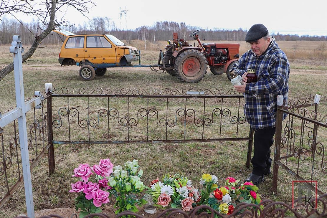 Па дарозе да наступнай зніклай вёскі з назвай Запаляны спыніліся каля абнесенай агароджай магілы. Крыж, кветкі, лампадкі, крэселка пад яблыняй… На першы погляд, тут свой вечны спачын знайшоў чалавек, памяць пра якога клапатліва аберагаюць родзічы. Але гэта меркаванне было памылковым: паставіў крыж і добраўпарадкаваў магілу мой суразмоўца, ён жа круглы год клапоціцца пра парадак на ёй.
