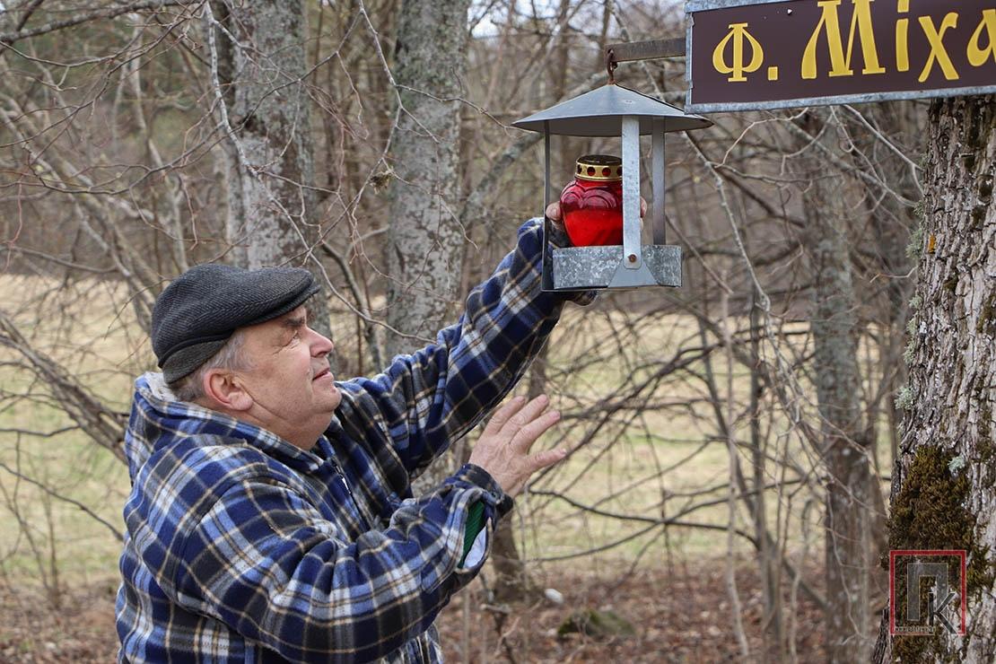 …Адны называюць Міхася дзіваком, другія дзякуюць за яго справы. А ён іх робіць, бо шануе карані, паважае продкаў і шчыра верыць у Бога. Менавіта таму хрыстовец зрабіў і ўсталяваў крыж на могілках і крыж на скрыжаванні дарог у роднай вёсцы. Менавіта яго доўга разглядала перад ад’ездам у Паставы. І ён мне падаўся сімвалам веры ў тое, што памяць будзе жыць не толькі пра памерлых людзей, але і пра зніклыя вёскі…