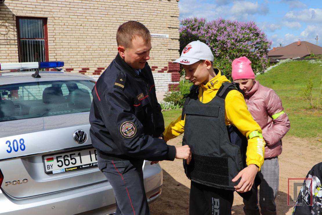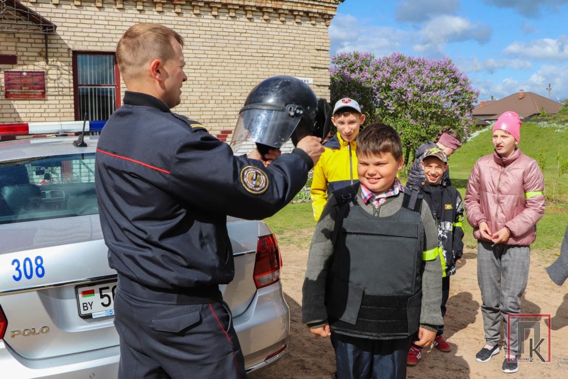 Также ребята обрадовались возможности примерить на себя милицейский бронежилет и шлем. В завершение встречи — общее фото на память.