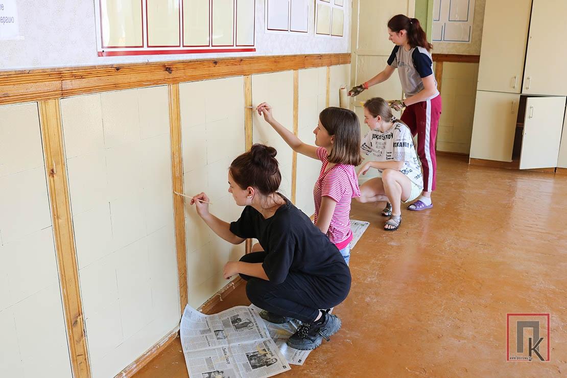 Ужо ў двары школы па паху фарбы можна было здагадацца: тут ідзе рамонт. Пачаўся ён 22 чэрвеня: менавіта тады прыступілі да работы члены атрада пад кіраўніцтвам настаўніцы інфарматыкі Рыты Макруш і рамонтнай брыгады, якой кіруе настаўніца матэматыкі Галіна Галадовіч.