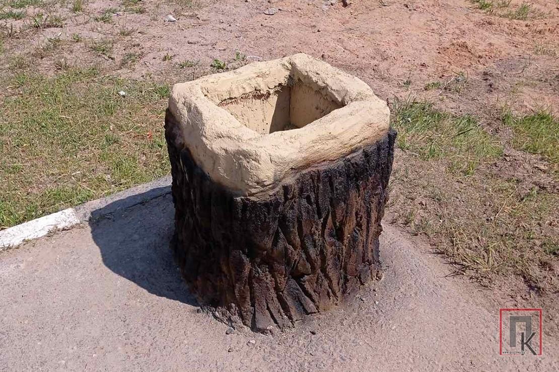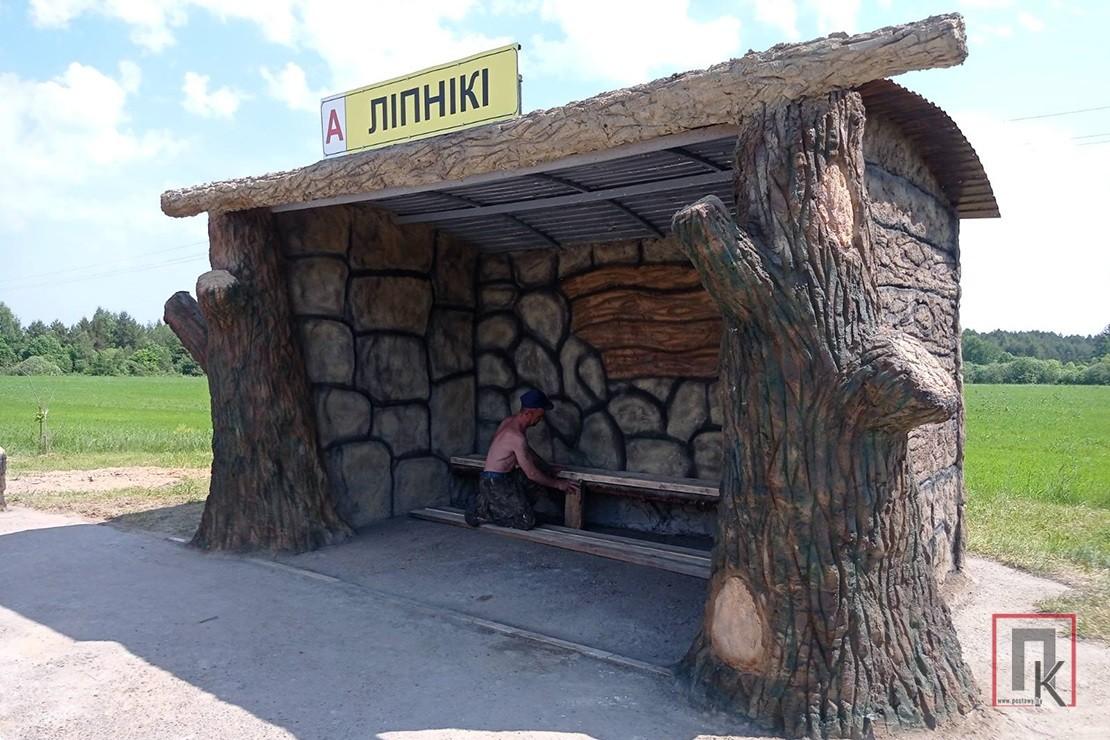— Предыдущий павильон был установлен 16 лет назад и уже отслужил свой срок: металл покрылся ржавчиной, в негодность пришли крепежи, стали отваливаться боковые листы, — рассказывал начальник линейной дорожной дистанции ДЭУ-33 Алексей Шаломицкий. — Решили восстановить собственными силами. В том районе установлена скульптура человека с камнем, поэтому мы тоже решили пофантазировать и сделать что-то весёленькое. Изготовили сварные каркасы, обвязали их сеткой, заштукатурили и покрыли акриловой краской под дерево. Если говорить по-простому, такой стройматериал называется арт-бетон. Он отличается высокой прочностью и пластичностью, его легко отшлифовать или создать имитацию натурального камня или дерева.