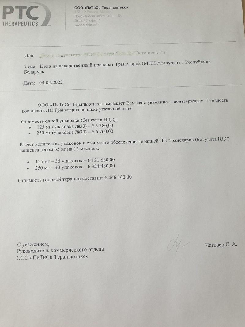 Консилиум Министерства Здравоохранения РБ от 29.03.2022 г.№4-5-3/ П -533 рекомендовал лечение лекарственным средством TRANSLARNA(АТАЛУРЕН). Стоимость годовой терапии составляет 504 161 евро (с учетом НДС, таможенного сбора). Лечение взрослых пациентов на уровне государства не предусмотрено. Наш взрослый сын ждал это лекарства и дождался.