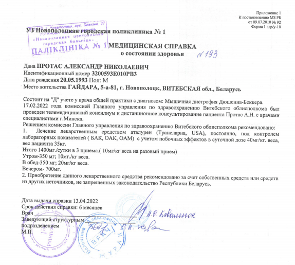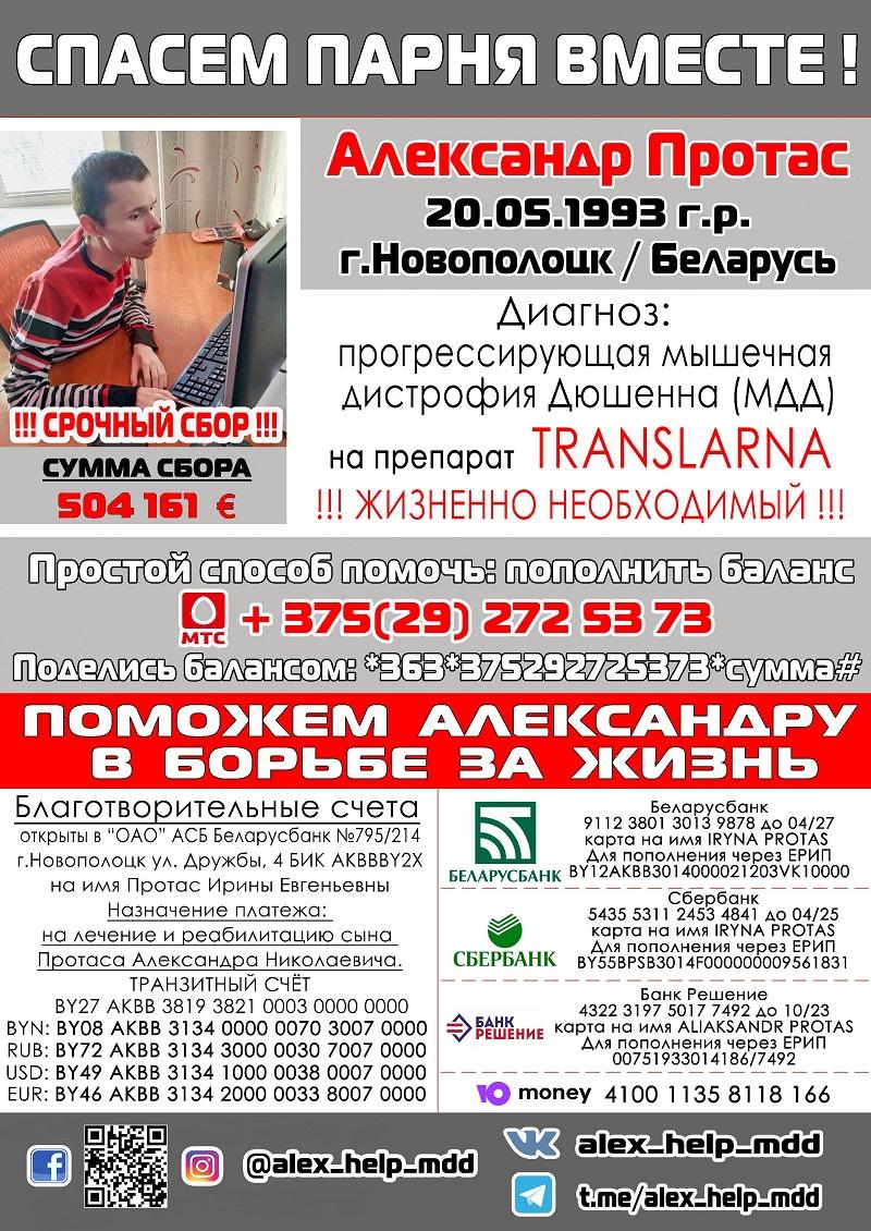 Высокая стоимость отнимает этот шанс, так как такую сумму не то что заработать, а сложно представить обычной трудолюбивой белорусской семье. Я, мать Протас И.Е. работала в отделе образования, награждена грамотой за многолетний добросовестный труд в системе образования. На сегодняшний день осуществляю уход за сыном. Отец Протас А.Н. работает ОАО ”Нафтан”. Сын Александр на данный момент не является студентом. Времени осталось мало, каждый день отнимает у него силы. Чем быстрее мы соберем на лекарство, тем раньше сможем остановить дистрофию мышц.