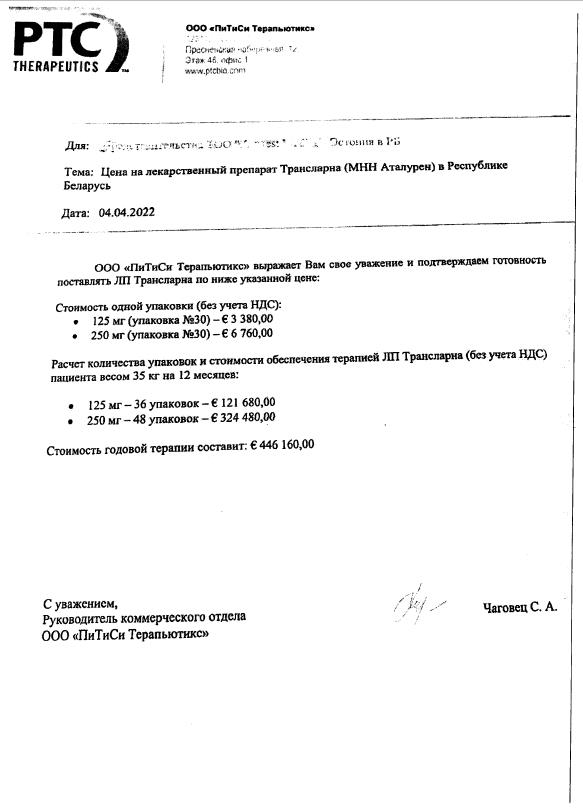 Консилиум Министерства Здравоохранения РБ от 29.03.2022 г.№4-5-3/ П -533 рекомендовал лечение лекарственным средством TRANSLARNA(ATATiyPEH). Стоимость годовой терапии составляет 504 161 евро (с учетом НДС, таможенного сбора). Лечение взрослых пациентов на уровне государства не предусмотрено. Наш взрослый сын ждал это лекарства и дождался.