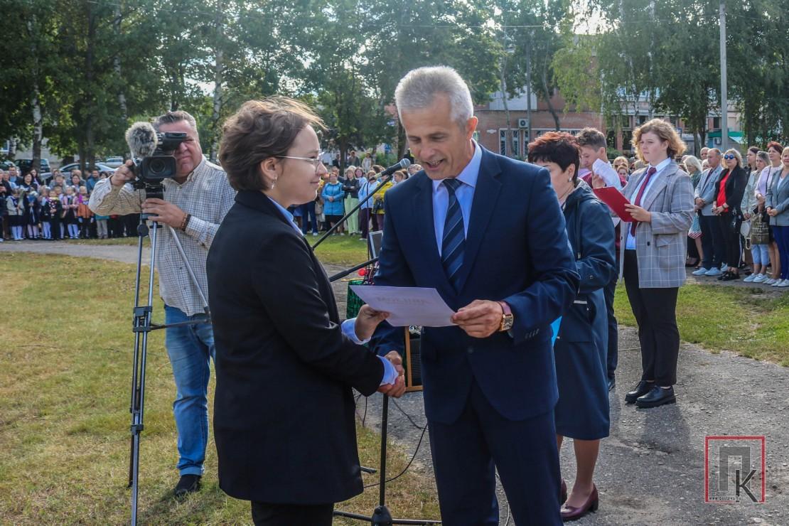 З віншаваннямі і пажаданнямі да прысутных звярнуўся і дырэктар установы адукацыі. Ён уручыў дыпломы вучням, якія ў мінулым навучальным годзе вызначыліся ў розных алімпіядах і конкурсах. Таксама былі прадстаўлены новыя педагогі, якія прыйшлі працаваць у СШ №1. Гэта кіраўнік ваенна-патрыятычнага выхавання Максім Салавей і настаўніца рускай мовы і літаратуры Кацярына Каравацкая.