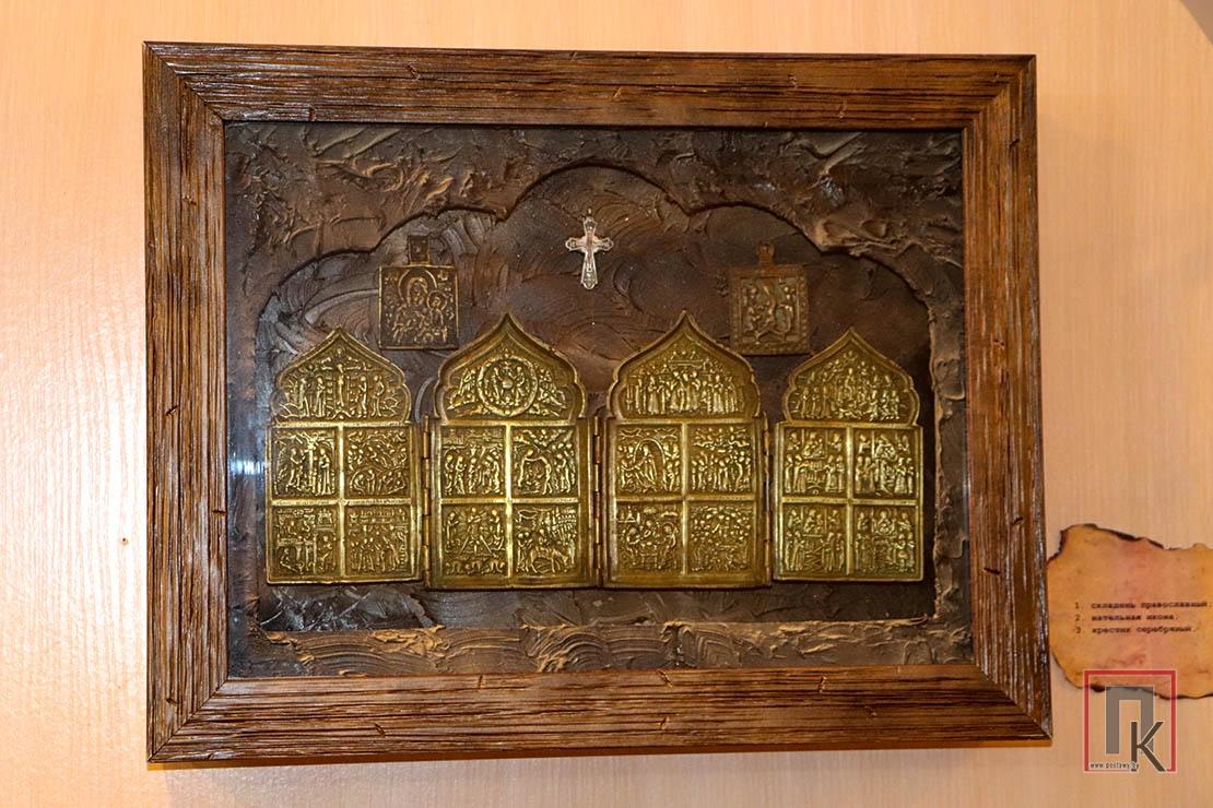 Некоторые из предметов экспозиции действительно уникальны. Так, например, прихожане передали в фонд складень (складывающиеся православные иконы) и крест XIX века. Как они связаны с Первой мировой?