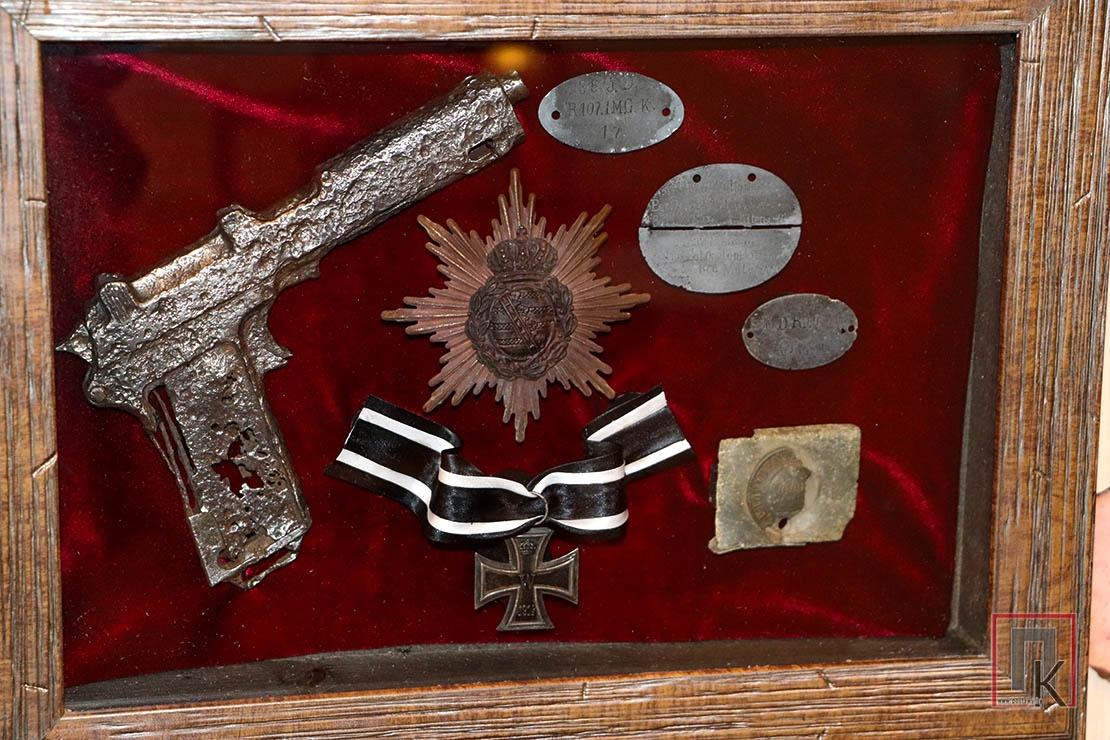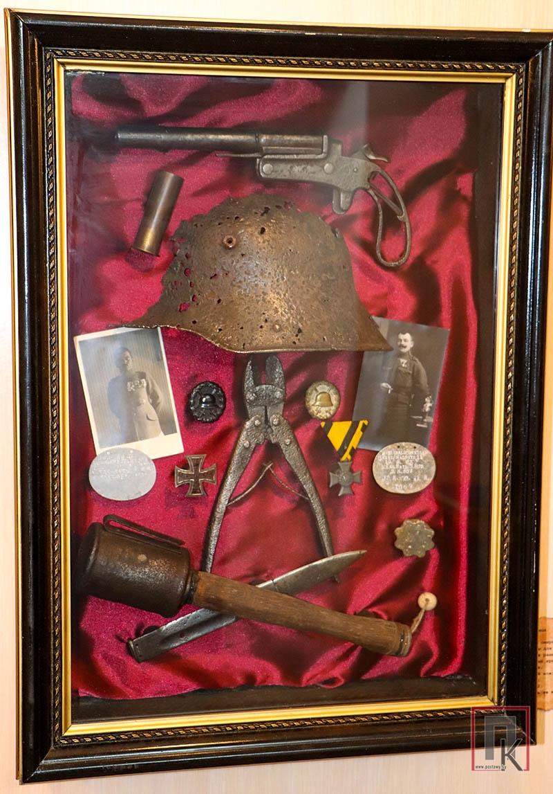 — Практически все вещи принадлежат солдатам, воевавшим в годы Первой мировой на территории Мядельского, Поставского, Вилейского районов. Через них проходила линия фронта, и здесь были самые кровопролитные бои Нарочской наступательной операции 1916 года, — рассказывал руководитель мядельского филиала фонда «Крокі» Святослав Гаврис. — Что-то из экспонатов находили на местах боёв и захоронений, что-то приносили люди. Мы также просили священнослужителей Мядельщины, чтобы во время служб в костёлах и церквях они рассказали прихожанам о нашей работе по сохранению памяти о Первой мировой войне, поиске предметов того времени. И люди отозвались — принесли немало фотографий, документов, ценных вещей. Так постепенно наполнилась экспозиция, которую мы не раз показывали в Минске, агротуристическом комплексе «Наносы» и других местах.