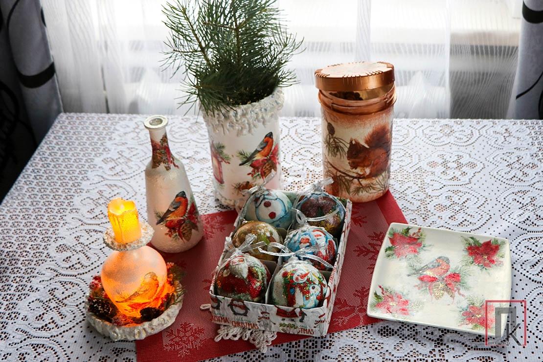 З цікавасцю разглядаю работы: чырванагрудыя снегіры, рудая вавёрка і мноства казачных зімовых герояў упрыгожылі вазачкі, кантэйнер для захоўвання арэхаў, падсвечнікі, ёлачныя шарыкі… Усе яны выкананы вельмі акуратна, што называецца, з душой. Складваецца ўражанне, быццам гэта самы сапраўдны рукатворны роспіс.