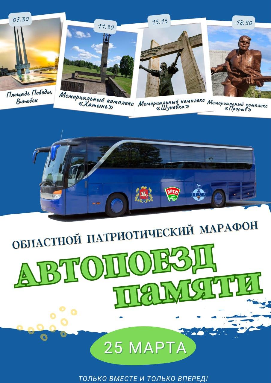 Областной патриотический марафон «Автопоезд памяти» состоится 25 марта в рамках республиканской акции «Беларусь помнит», посвященный Году мира и созидания, 85-летию Витебской области и 80-летию трагедии Хатыни и Шуневки.