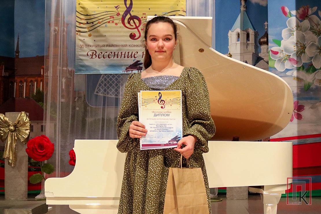 Увогуле, прадстаўнікі судзейскай калегіі не паскупіліся на ўзнагароды і раздзялілі ўсе прызавыя месцы. Калі гаварыць пра нашых канкурсантаў, то ў малодшай «А» групе дыпломамі І ступені ўзнагароджаны Валерыя Шакола, Арына Петух і Дар’я Пачкоўская, ІІ ступені — Марыя Дзісько і Вераніка Татун з Варапаеўскай ДШМ, ІІІ ступені — Лізавета Падгайская. У малодшай «Б» групе, акрамя Варвары Базелевай, дыпломаў І ступені ўдастоены Надзея Амяльчак і Аляксандра Новікава, ІІ ступені — Дамініка Борыс і Ганна Лысёнак, ІІІ ступені — Аліса Юркова, Паліна Балай з Варапаеўскай ДШМ і Васіліса Валабуева з Навасёлкаўскага філіяла. У сярэдняй групе 2-е месца і адпаведны дыплом у Ксеніі Тамілінай, 3-е месца — у Дар’і Грэські і Паліны Януш. У старэйшай узроставай групе 2-е месца заняла Ганна Колесень. Гран-пры конкурсу сёлета дастаўся навучэнцу Лепельскай ДШМ Максіму Мігно.