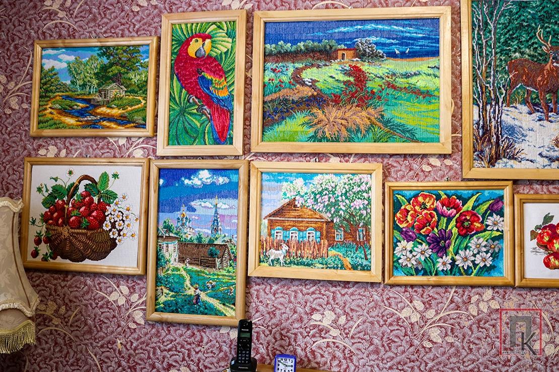 — Любімыя ўсе, — адказвае. — Узоры бяру з часопіса «Ксюша». З нецярпеннем чакаю кожны новы нумар. Выбіраю ўзор, які найбольш спадабаўся. Бывае, і па два месяцы над адной карцінай сяджу. Але мне гэта ў радасць. Канечне, вочы стамляюцца, без акуляраў не магу.