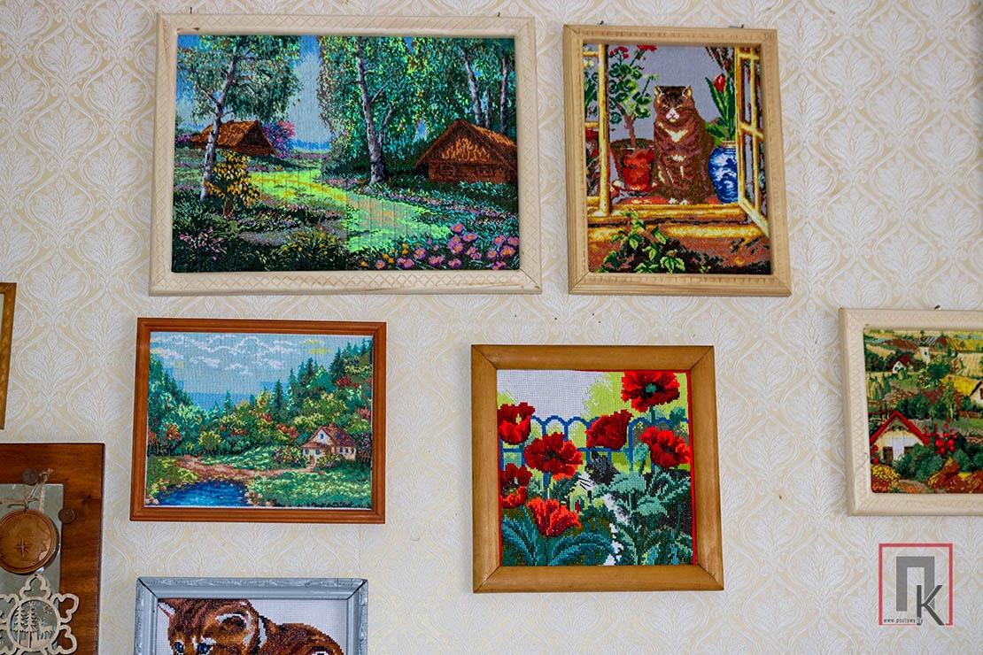 Затое колькі прыгажосці ў кожным пакоі! На сценах — дзясяткі карцін: стройныя беластволыя бярозкі ля сіняй стужкі ракі, прывабны домік на пагорку, грацыёзны алень, жвавыя сінічкі на заснежанай рабіне, яркія кветкі… Ды хіба магчыма пералічыць усё?