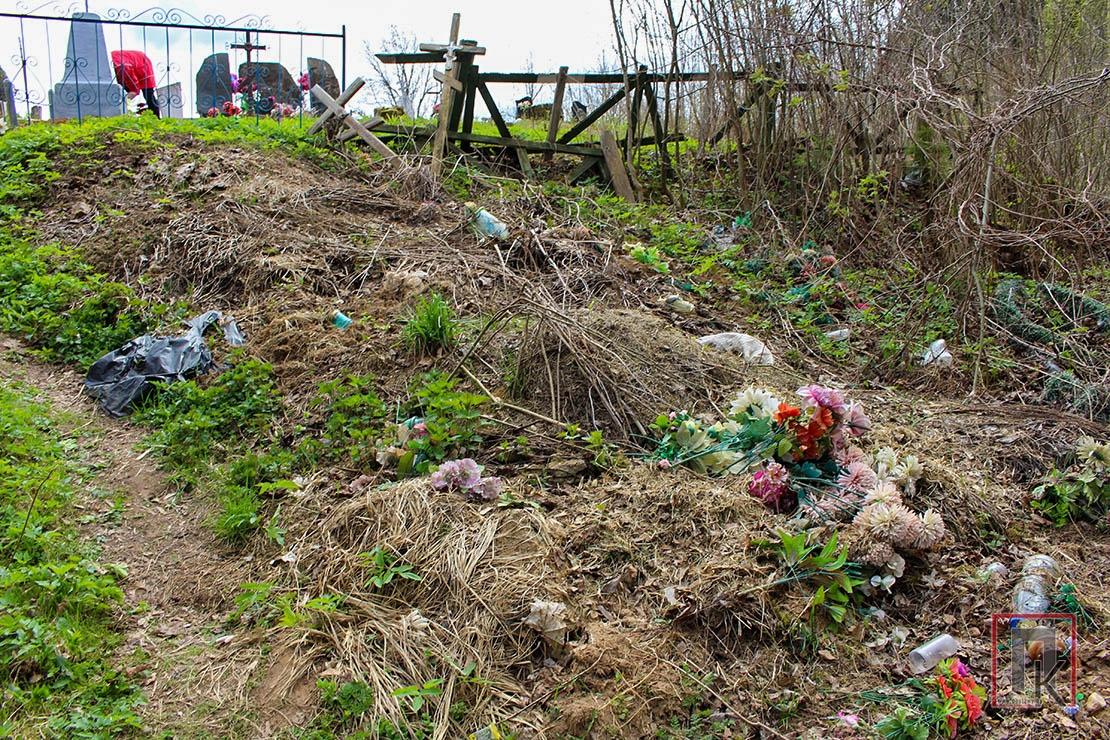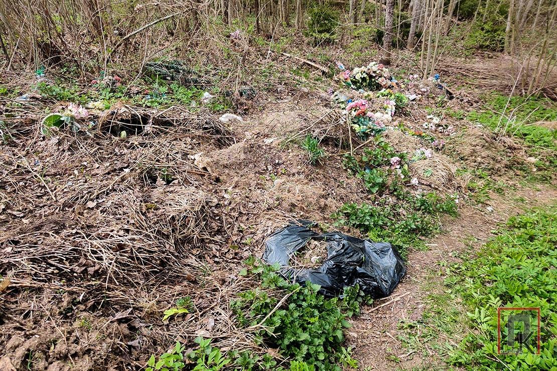Рассматриваю фотографии. Территория кладбища довольно большая, ухоженная: трава скошена, недалеко от входа стоит контейнер для мусора, чуть поодаль оборудована площадка для складирования отслуживших свой век венков. И то, и другое используется по назначению. А вот за кладбищем, буквально в нескольких шагах от ограды, картина диаметрально противоположная: горы прошлогодней листвы и травы, суки, пластиковые цветы, банки, бутылки и другой мусор.