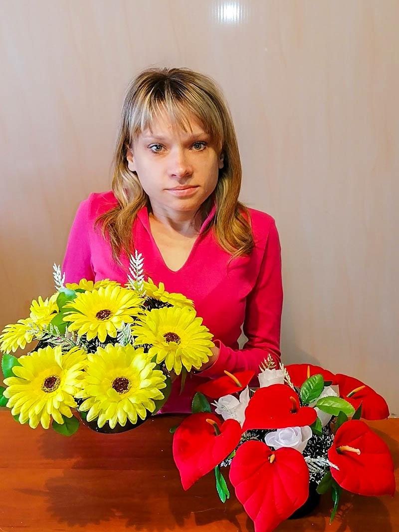 Дзяўчыне 28 гадоў. Яна мае праблемы з апорна-рухальным апаратам, з’яўляецца інвалідам II групы. Пэўны час знаходзілася ў гэтым аддзяленні на адаптацыі. Падчас заняткаў у гуртку дэкаратыўна-прыкладнога рукадзелля пад кіраўніцтвам Алены Конан навучылася вырабляць арыгінальныя, крэатыўныя рэчы. Са жніўня мінулага года дзяўчыну прынялі сюды на работу на 0,25 стаўкі.