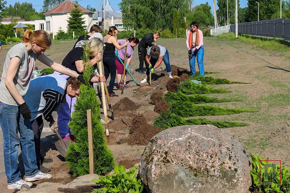 Праязджаючы на мінулым тыдні каля Навасёлкаўскай сярэдняй школы імя А. А. Валодзькі, не магла не спыніцца: у двары кіпела работа — ішла пасадка туй.