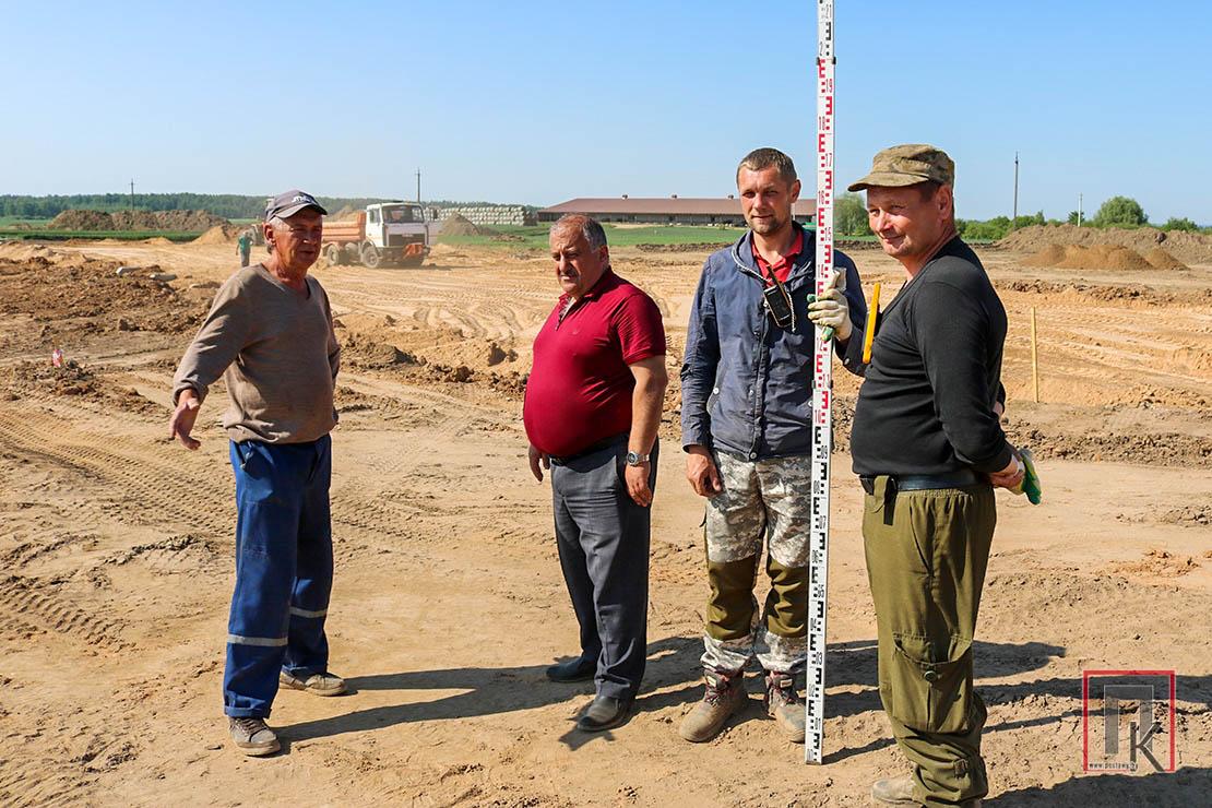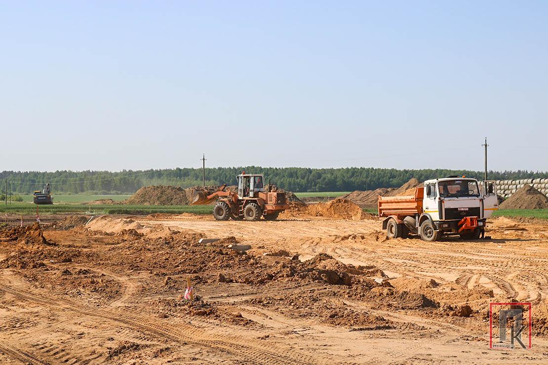 Пакуль тут задзейнічана ў асноўным дарожная тэхніка, якая вывозіць грунт, раўняе пляцоўку пад будаўніцтва. Электрыкі пераносяць лінію электраперадачы, працуюць іншыя спецыялісты. Прадстаўнікі прадпрыемства «Камплект Наладка» з Наваполацка рыхтуюць месца пад заліўку фундаменту і будуць манціраваць паўрамы.