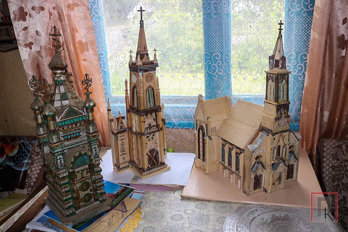 — Гэты з металу, — расказвае. — Важыць больш за 7 кілаграмаў. Арыгінала не існуе, усё — мая фантазія. Штосьці прыдумаў сам, некаторыя элементы ўзяў з канкрэтных цэркваў. Кожную частку макета храма ствараю асобна. Пачынаю з верхніх элементаў і «спускаюся» ўніз. Затым злучаю ўсё ў адно цэлае. Працую ўрыўкамі, гадзіны чатыры на дзень. Найбольш складана даюцца купалы і крыжы. Але калі ёсць жаданне і ў выраб укладваеш душу, то ўсё атрымліваецца. На адзін макет затрачваю прыкладна месяц.