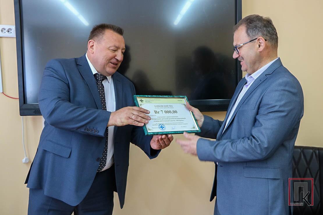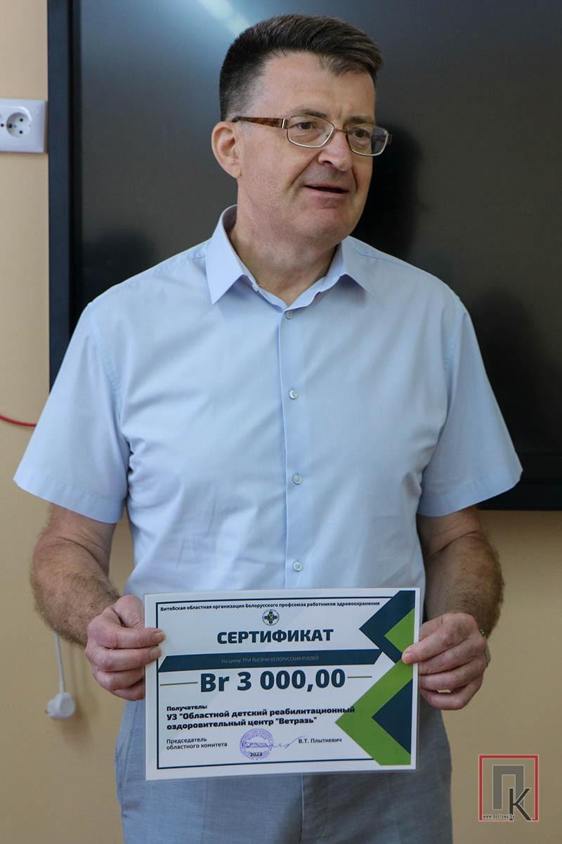 — Мы не могли остаться в стороне и округлили 7 тысяч, выделенных республиканским профсоюзом, до 10-и, — вручая сертификат на 3 тысячи рублей главврачу центра, с юмором говорил председатель областной организации профсоюза Владимир Плыткевич. — Вместе с сертификатом примите слова восхищения целенаправленной работой коллектива по улучшению жизни детей, в том числе с ограниченными возможностями.
