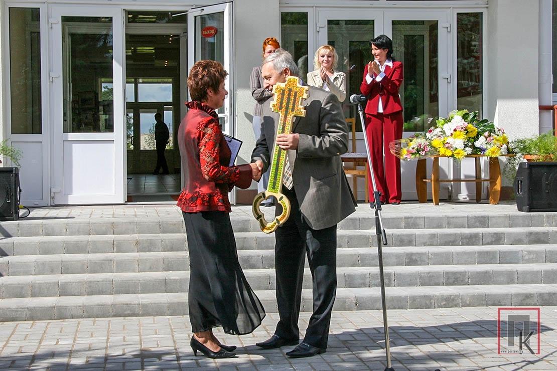 — Для нашага калектыву і ўсіх гараджан цудоўным падарункам да рэспубліканскага свята стаў абноўлены раённы Дом культуры. Будынак быў узведзены ў 1974 годзе і меў статус Дома афіцэраў. У пачатку 90-х, калі воінскія часці вывелі з Пастаў, яго перадалі ў камунальную ўласнасць раёна і тут размясціўся раённы Дом культуры. Установа была вельмі запатрабаванай, у ёй праводзіліся самыя значныя мерапрыемствы. Але за некалькі дзесяцігоддзяў знешняе і ўнутранае афармленне РДК, інжынерныя камунікацыі састарэлі.