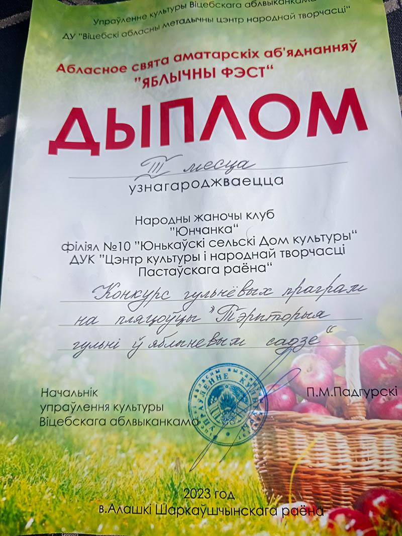 Ужо не першы год аматарскія аб’яднанні раёна прымаюць удзел у абласным свяце «Яблычны фэст». І кожны раз знаходзяць мноства спосабаў здзівіць гасцей і членаў журы: ці гэта смачны пірог, ці «яблычны карагод». А настрой і жаданне праявіць сябе дапамагаюць заваёўваць дыпломы ў розных намінацыях. Спадзяёмся, што і надалей нашы аматарскія аб’яднанні будуць актыўна ўдзельнічаць у святах і дарыць людзям добры настрой і радасць!