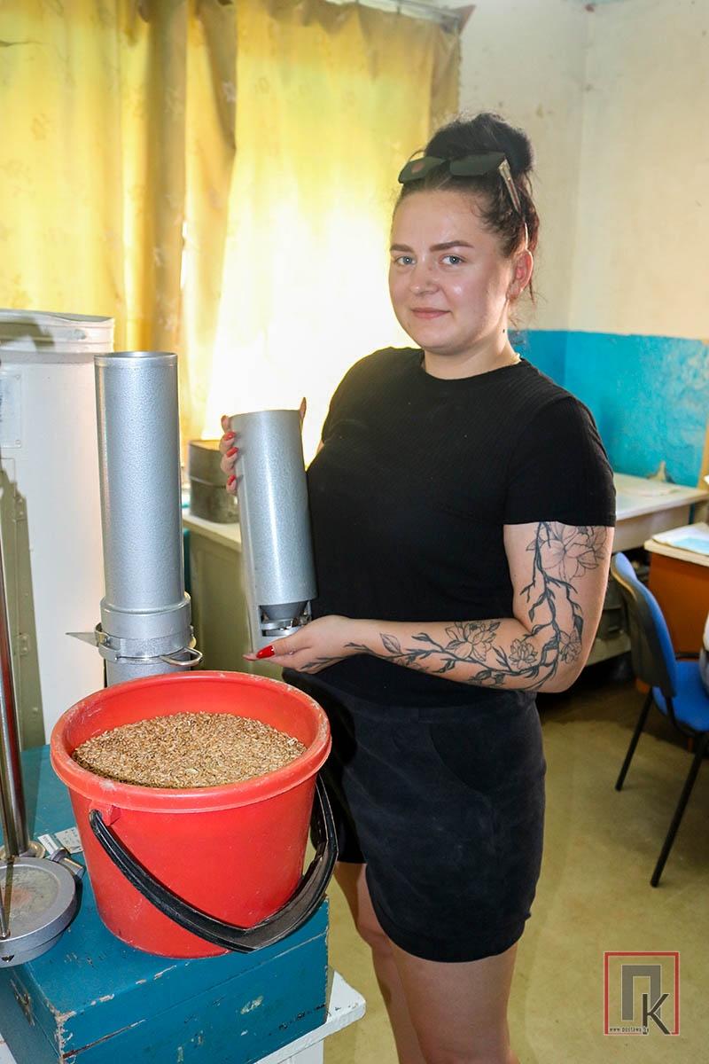 — Мы праводзім аналіз зерня на колер, пах, заражанасць шкоднікамі, утрыманне розных прымесей, — расказвала майстар. — Вызначаем натуральную вагу, вільготнасць. Яна ў дажджлівыя дні даходзіла да 26%. А каб збожжа надзейна захоўвалася, паказчык павінен быць 13%. Дасушваннем збожжа займаецца сушыльны майстар Ілья Мычко. Сёлета філіял аказваў гаспадаркам таксама паслугу па сушцы рапсу.