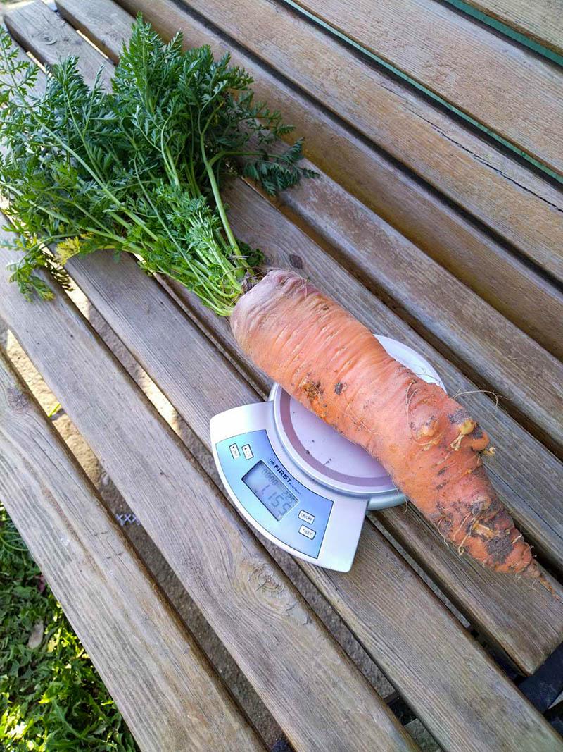 весом 1 кг 155 г выросла на грядке у Лины Мешкело. Название сорта моркови хозяйка не припомнит, так как обычно высевает овощ рандомным способом. Осенний «сюрприз» обнаружила её дочь Виктория, приехавшая семьёй к ней погостить из Минска. Лина Антоновна признаётся, что и сама впервые в жизни увидела морковь такого размера и, смеясь, добавила:
