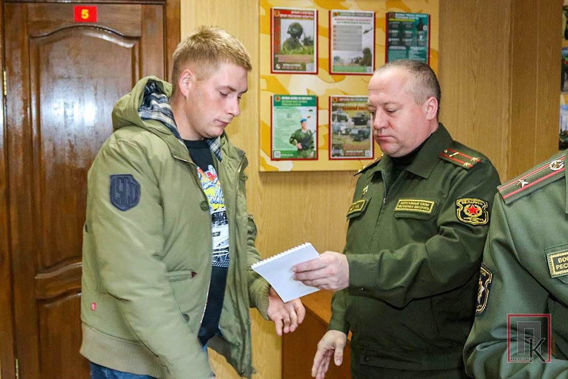 1 лістапада ў 3.45 яны разам з роднымі сабраліся каля раённага ваеннага камісарыята. А ў 4.00 аўтобус з прызыўнікамі накіраваўся на зборны пункт абласнога ваенкамата, дзе іх размяркуюць на пункты пастаяннай дыслакацыі. Я сустракалася з будучымі абаронцамі Айчыны напярэдадні. У аўторак начальнік групы прызыву на ваенную службу райваенкамата Валерый Баравік правёў для іх стандартны інструктаж, адбылася зверка дакументаў. Ваенны камісар раёна Мікалай Кулік ад раённай арганізацыі РГА «Белая Русь» уручыў хлопцам сувеніры.