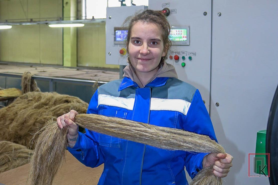 Рулоны тресты с шохи доставляются в цех. Здесь автокаром подаются на стол размотки. Треста проходит через сушилку. Первыми сырьё в одной из трёх смен получают Ольга Борис, Владимир Ракита и Павел Гедюк. Мужчины здесь временно: один из них механизатор, второй — оператор котельной. Они аккуратно раскладывают тресту, ровняют её, чтобы не было комков. Работа требует постоянной концентрации внимания. Затем треста поступает в мялку, где происходит отделение костры от стебелька. Далее по технологической линии — в трепальные барабаны, из которых выходит трёпаное волокно. Его снимает оператор Вероника Шкелко.
