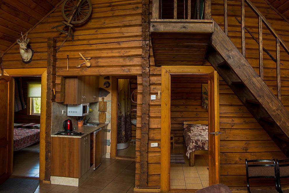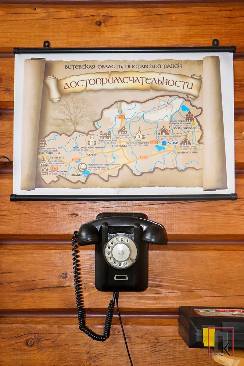 Меня же в тот день ждала экскурсия по территории усадьбы, расположенной совсем недалеко от озера. С хозяином зашли в каждый из домов. И сами они, и мебель в них сделана из натуральных материалов (видимо, поэтому туристы постоянно говорят об отменном сне в «Лучайском кутке»). Есть бытовая техника, чай-кофе, приправы, крупы… Обращаю внимание на камины в домах, возле которых в снежную морозную зиму будет особенно комфортно. Построена на участке и баня (по отзывам в интернете она превосходная).