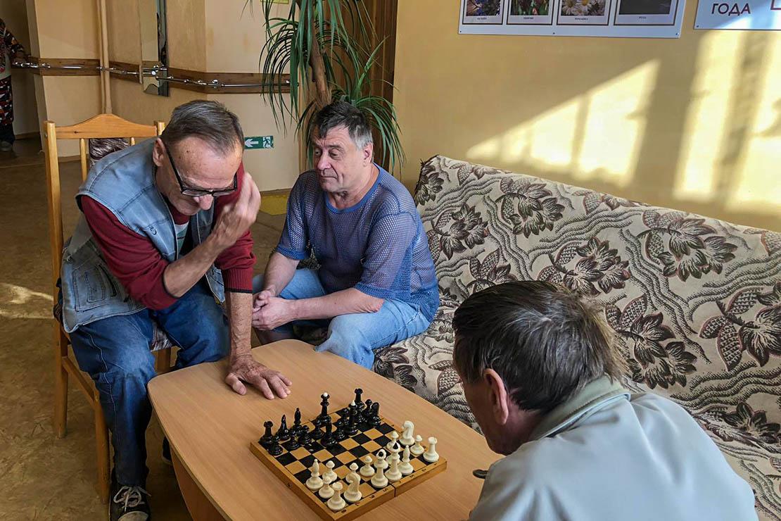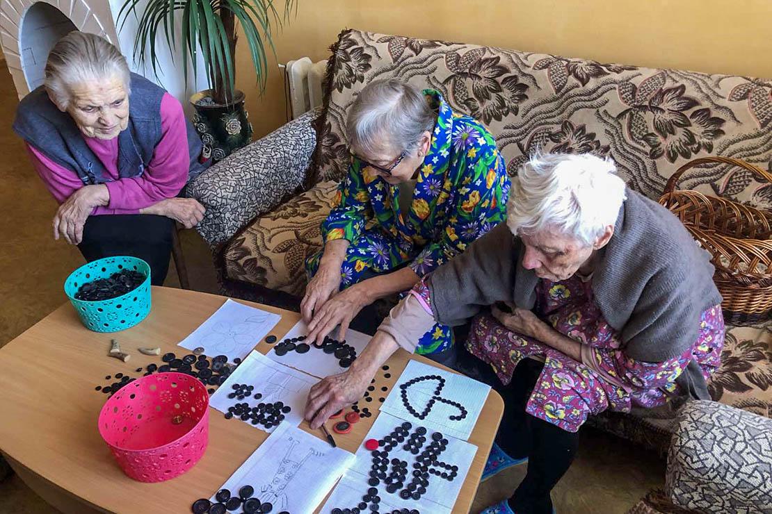 С годами человек часто не может запоминать происходящее, начинает забывать, куда положил свои очки, закрыл ли дверь, выключил ли свет. Однако подобные возрастные проявления, если это не болезнь Альцгеймера, обратимы. Мозгу, как и мышцам, тоже периодически нужна нагрузка — умственная. Его нужно тренировать, повышать его активность. Проживающих в отделении мы приобщаем к работе с мелкими предметами, что очень важно для головного мозга. Женщины сортируют пуговицы, выкладывают из них фигуры. Мужчины играют в шахматы, что тоже тренирует ум.