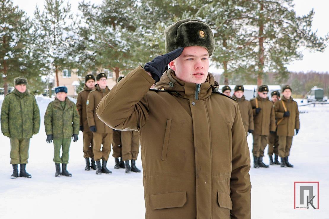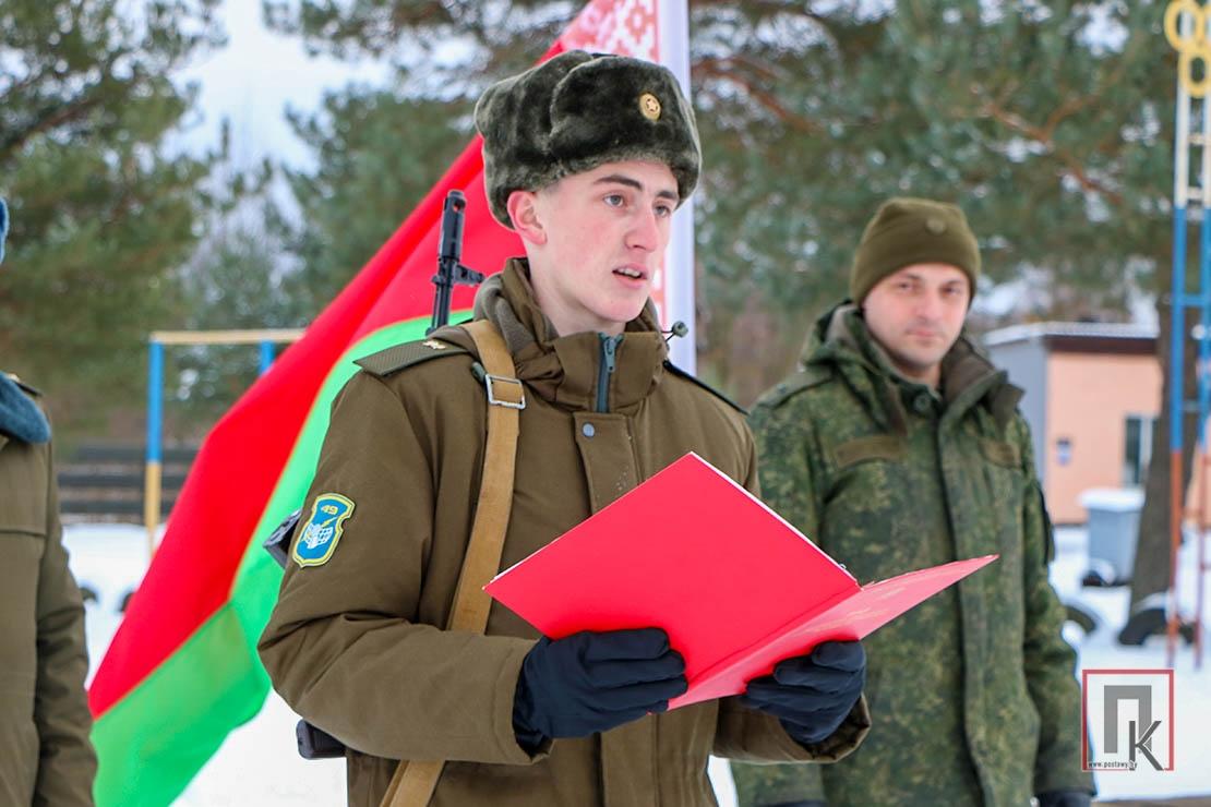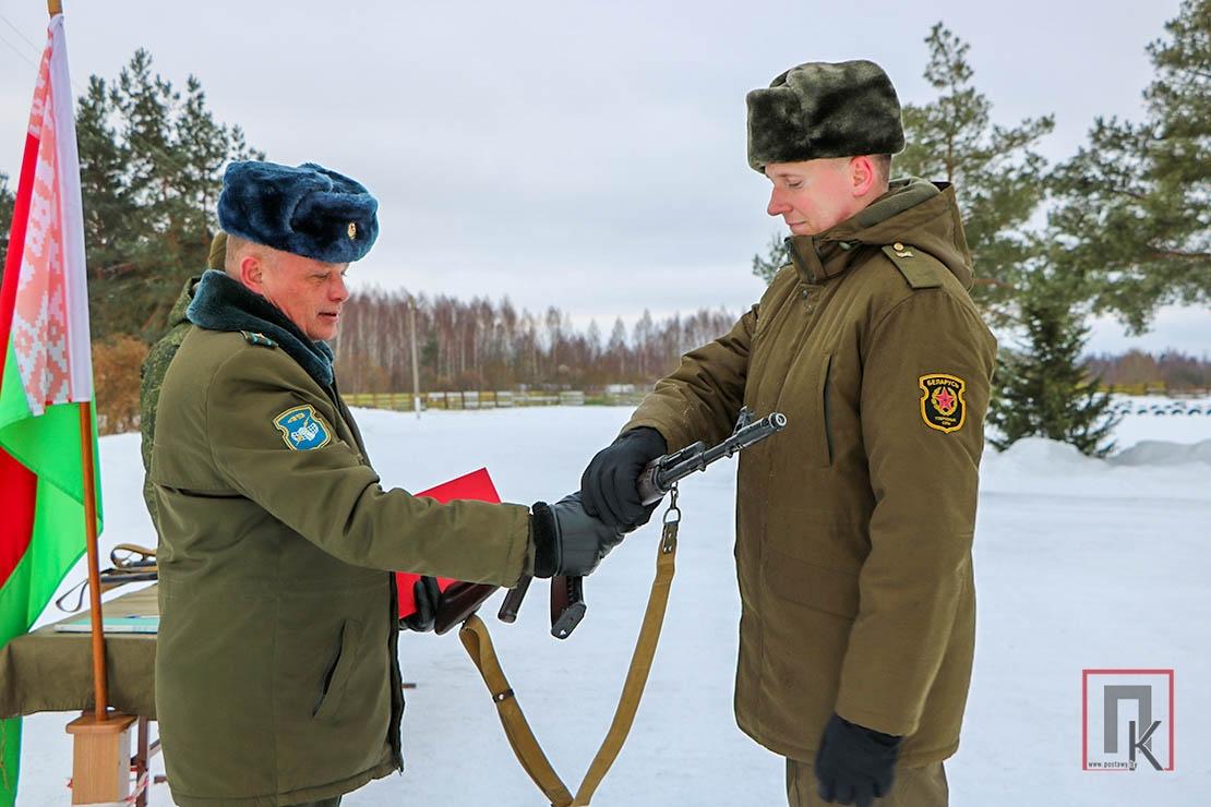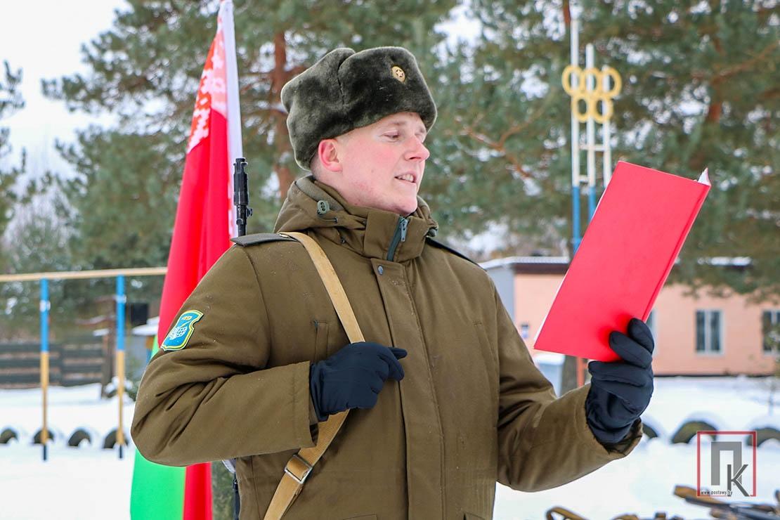 Перед сомкнутым строем сослуживцев военнослужащие приняли личное боевое оружие и кодекс защитника Отечества. Это своеобразная мини-присяга, только даётся она не белорусскому народу, а своему армейскому коллективу. Произнёс слова-обещания и наш земляк Дмитрий Счастный.