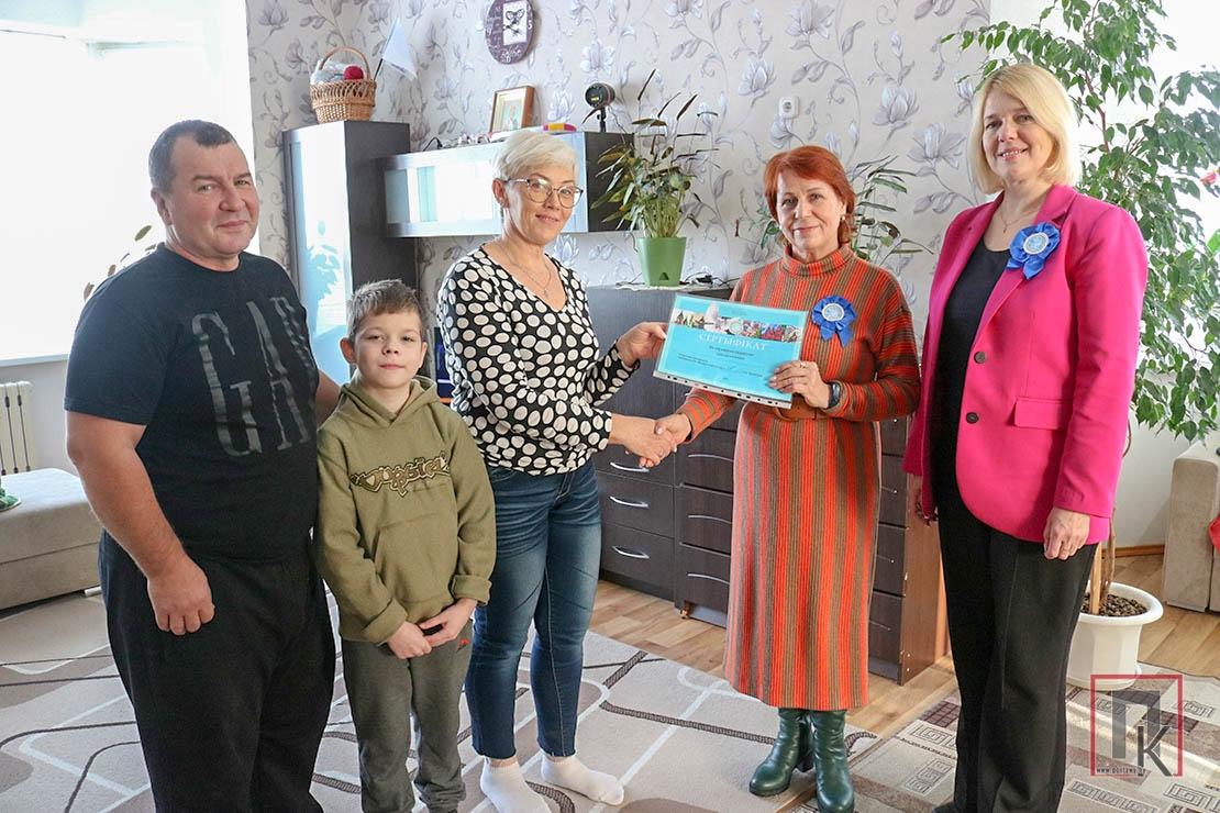 Яе вырабіў пад заказ наш завод «Паставымэбля». А сертыфікат на падарунак, які крыху раней даставілі па ўказаным адрасе, прывезлі старшыня Пастаўскага аддзялення Беларускага фонду міру, начальнік аддзела ідэалагічнай работы і па справах моладзі райвыканкама Галіна Чаплінская і галоўны спецыяліст аддзела, член раённай арганізацыі Наталля Субко.