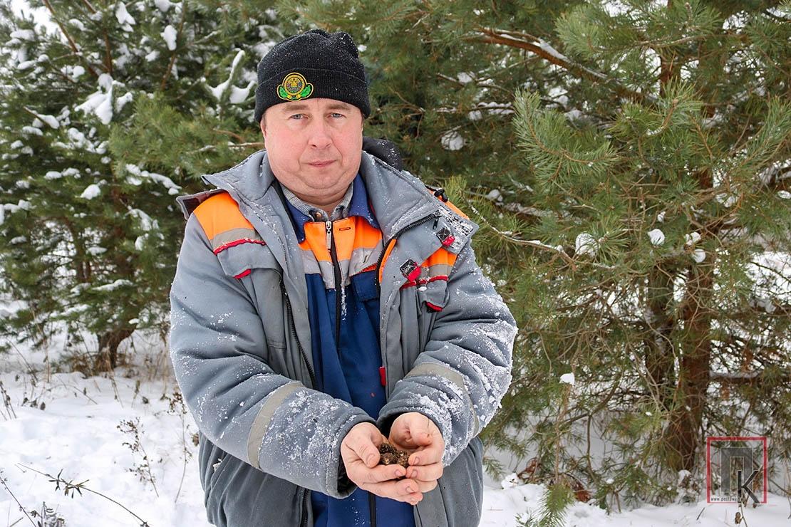 Отправляюсь в лес напротив деревни Черты, чтобы понаблюдать за процессом их сбора. Зимний лес завораживает. Но любоваться заснеженными деревьями не получается: впереди меня по лесной дороге идёт лесничий Поставского лесничества Виктор Клянцевич, за которым еле успеваю.