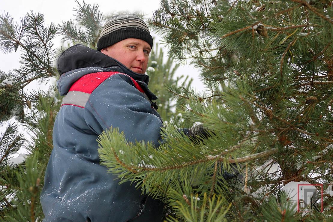Лес заканчивается, и мы выходим на поле, где несколько лет тому высажены молодые ели и дуб. Переступаем с борозды на борозду, утопая в глубоком снегу. Виктор делает это легко и привычно, я же — с усилием. Преодолев поле с посадками, встречаем лесников, которые ведут санитарные рубки. Они направляют нас дальше. И вот поляна с несколькими десятками сосен-самосеек. Некоторые укутаны зимним покрывалом, другие уже без белого наряда и шишек, снег вокруг них вытоптан. Понятно, что здесь урожай уже собран. Занимаются этим лесники Сергей Липницкий и Александр Свило. Сергей стоит на последней ступеньке высокой стремянки, специальным приспособлением нагибает верхние ветки и срывает с них шишки. Александр занят сбором урожая с веток, что пониже.