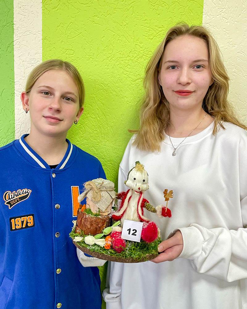В областной центр девочки ездили вместе с педагогом дополнительного образования РЦДМ, руководителем кружка «Соломенные фантазии» Татьяной Дегтярюк. Она и сама стала активной участницей конкурса — боролась за награды в творческом состязании педагогов Витебщины в номинации «Подарок Деда Мороза». Её новогодняя композиция, созданная с использованием лозы, еловых веток, яблок, мандаринов, шиповника и даже сушёных грибов, отмечена дипломом І степени.