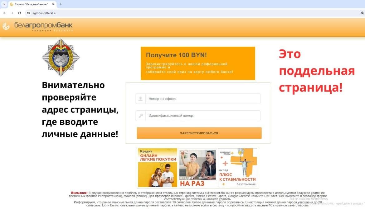 В Instagram реклама обещает призы от банка. При переходе по ссылке пользователь оказывается на фишинговой странице банка https://agrobel-refferal.su. Мошенники запрашивают номер телефона, личный (идентификационный) номер и код из полученного смс. Такие данные предоставляют мошенникам полный доступ ко всем вашим счетам в разных банках.