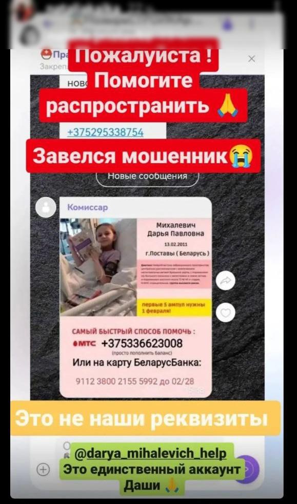 2 февраля в Поставский РОВД обратился гражданин Михалевич Павел Францевич с просьбой об установлении лица, которое в интернет-мессенджере «Телеграмм» разместило информацию от его имени о сборе денежных средств на лечение дочери Дарьи с измененными реквизитами.