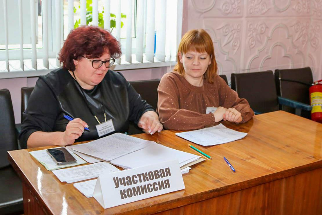 Члены избирательной комиссии Ирина Шкорник и Ольга Танана приняли списки проголосовавших на дому и сверяют фамилии избирателей с основными списками.