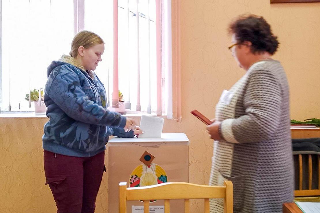 На избирательном участке № 9 в Волках впервые в голосовании участвовала Ксения Зеленкевич. Председатель избирательной комиссии Даната Черемных вручила на память Конституцию Республики Беларусь.